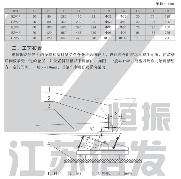 電磁振動(dòng)給料機(jī)的振幅和給料量受料倉倉壓影響較大,設(shè)計(jì)料倉時(shí)應(yīng)盡量減少倉壓,使溜咀后側(cè)板承受一定的倉壓,并設(shè)置斜溜沮及下料閘門。如圖,一般a=1/4b。溜咀四周應(yīng)與給料槽留有一定的間隙,一般5~10mm,以免產(chǎn)生噪音及影響振動(dòng)。